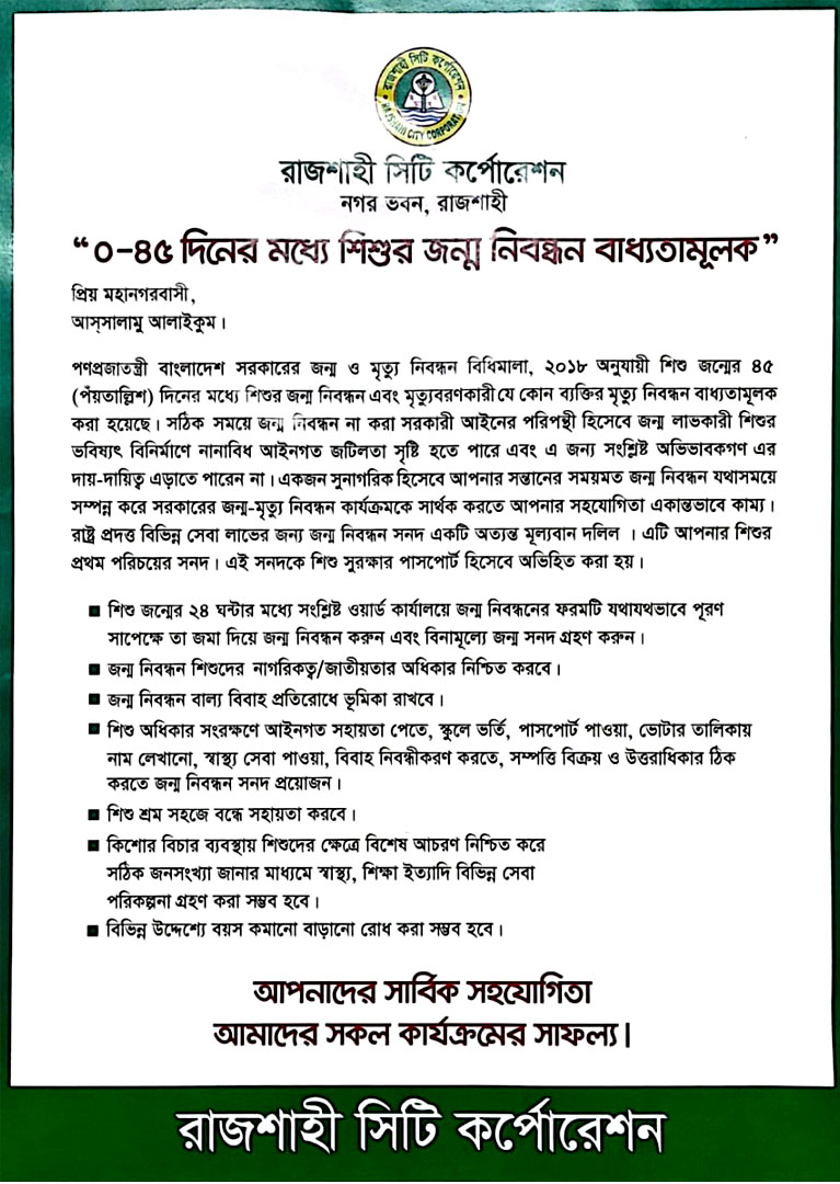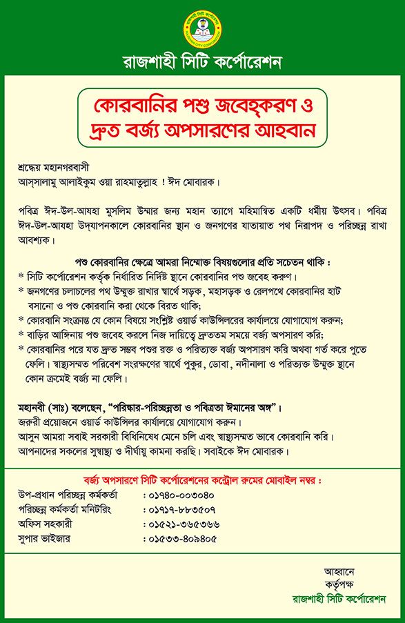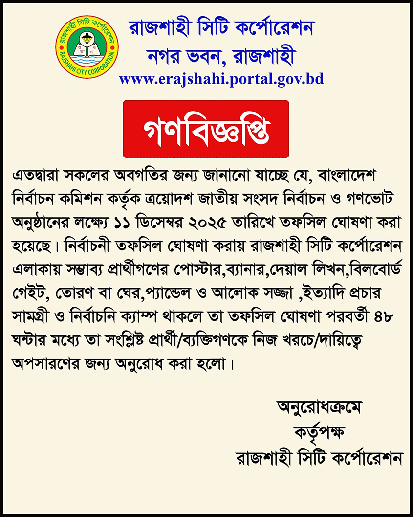 আসন্ন ত্রয়োদশ জাতীয় সংসদ নির্বাচন ও গণভোট ২০২৬ উপলক্ষে রাজশাহী সিটি কর্পোরেশনের ১০ দিনের কর্মপরিকল্পনার তথ্য প্রদান সংক্রান্ত নোটিশ